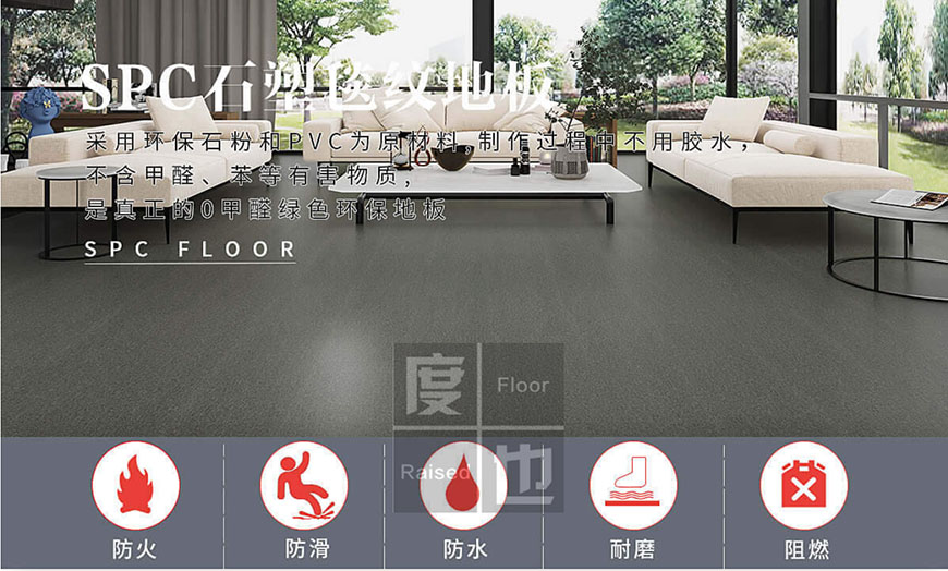 SPC 石塑地板主要由重質碳酸鈣、聚氯乙烯樹脂、聚氯乙烯穩(wěn)定劑組合的一定比例混合形成復合地鋪材料。經(jīng)過高溫塑化擠出片材,滾筒壓延熱敷彩膜裝飾層和耐磨層,表面在做一遍 UV 層,地面是一層天然軟木層,(天然軟木是基于紅酒瓶蓋的一種材質,不怕水,完全環(huán)保)不含任何有害物質,是99%不含甲醛的環(huán)保地板。