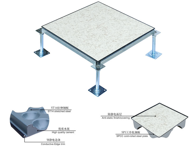 The panel is made of high-quality cold-rolled hard steel plate, and the bottom plate is made of deep-drawn steel plate. After the upper and lower steel plates are stamped and spot welded, they are phosphated and sprayed. The middle hollow shell is filled with high-quality high-strength foamed cement. After curing, a stable Load-bearing structure, the upper surface can be pasted with anti-static finishes such as HPL, PVC, rubber, etc. as needed, and static conductive edges are inlaid around it. This product is suitable for general computer rooms and monitoring rooms, etc.